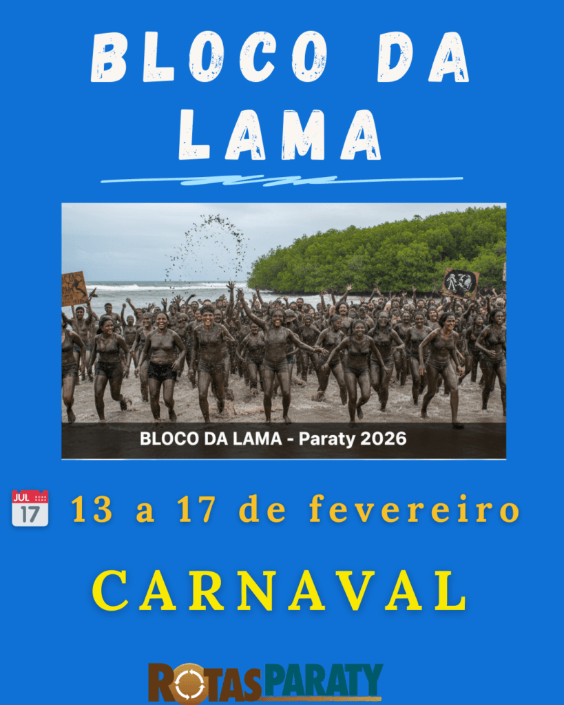É a atração mais famosa e exótica de Paraty. Os foliões se reúnem na Praia do Jabaquara, cobrem-se de lama medicinal do mangue e saem em cortejo pelas ruas (geralmente evitando o Centro Histórico preservado para não sujar o calçamento). O lema é “Uga, Uga, Rá, Rá!”, em uma celebração que remete aos tempos pré-históricos.